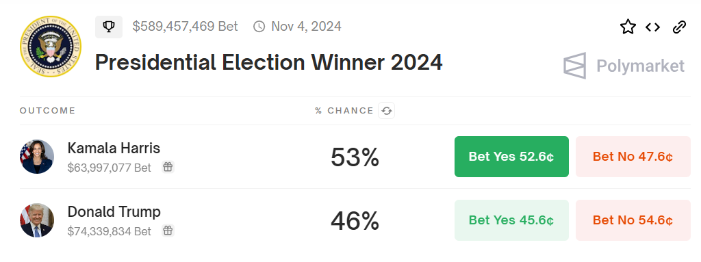Напомним, Джо Байден снял свою кандидатуру с выборов. Кандидатом от демократов стала вице-президент Камала Харрис. Ее администрация решила не повторять ошибок предшественника и тоже заручилась поддержкой криптосообщества. Ставка на крипту сработала. По состоянию на момент написания статьи, Харрис опережает Трампа на рынке прогнозов победителя президентской гонки США 2024.
