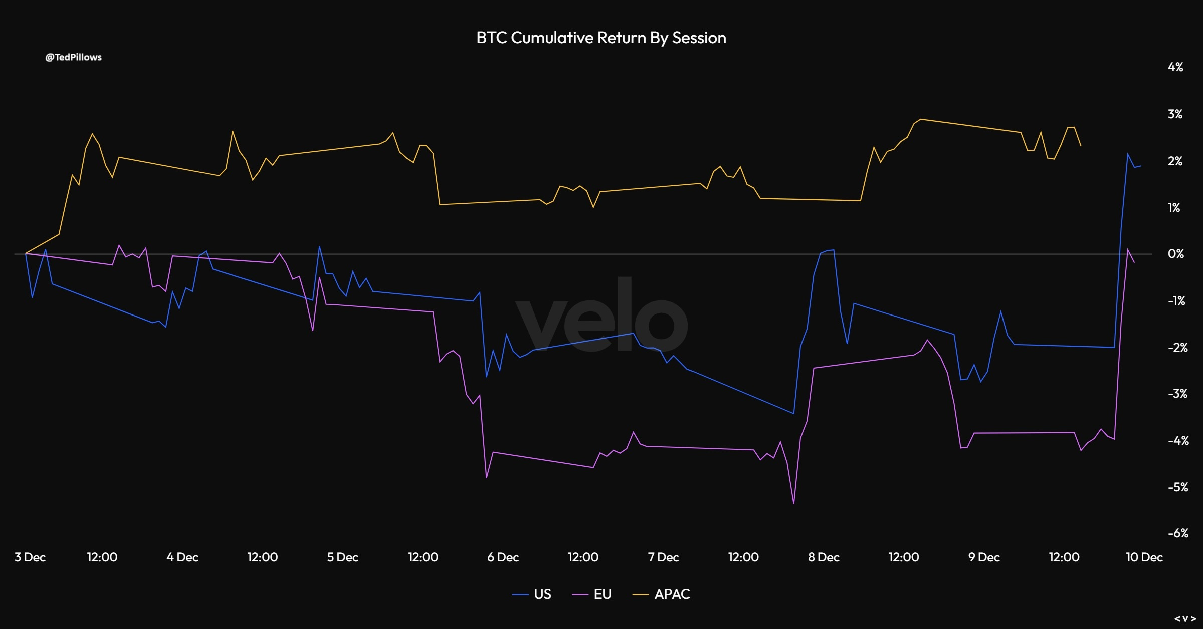 Ритм подчеркивает сдвиг влияния: активность APAC стала ключевой для устойчивости биткоина. Западные регионы действуют осторожно и чаще фиксируют прибыль, а Азия берет на себя роль основного источника спроса.