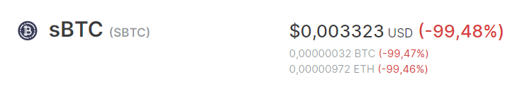 Клон биткоина в ценовом соотношении 1:0.0001 BTC на базе блокчейна Ethereum за сутки обвалился на 99%. На момент написания материала цена токена Soft Bitcoin (SBTC) составляет $0,003323 USD (-99,48%).