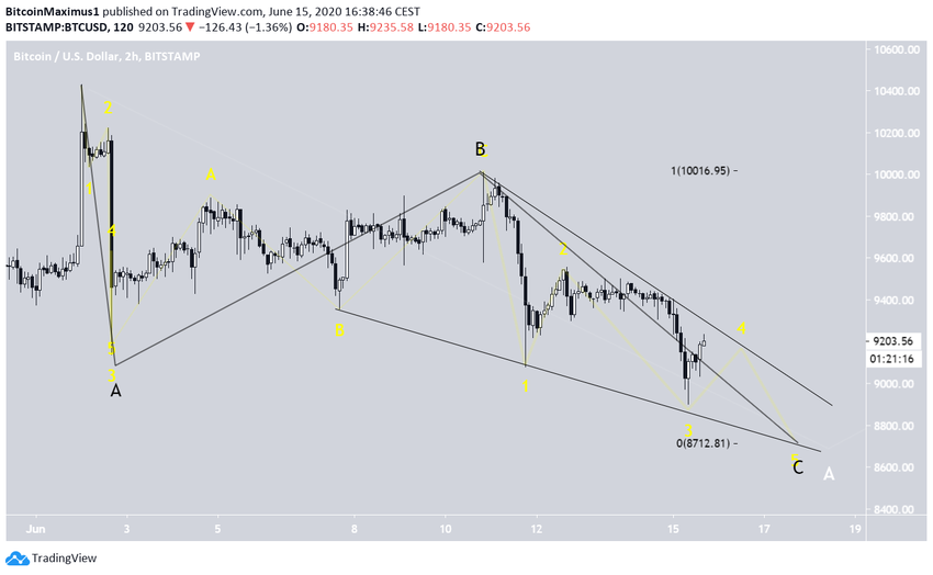 Последний сценарий волнового анализа, который мы рассмотрим, предполагает, что пятиволное импульсивное движение, предшествовавшее этой коррекции, завершилось не 7 мая, а 2 июня. В этом случае мы все еще находимся внутри волны А, которая приобретает форму зигзага (5-3-5).Однако рынок пока не завершил формирование этой волны, поэтому мы можем лишь строить догадки относительно такой более долгосрочной коррекции. После завершения текущей волны, более крупная волна В может отправиться на любой уровень в диапазоне между уровнями Фибо 0.38-0.79 коррекции всего медвежьего хода. Это может быть район $9400-$10000, но более точные значения будут зависеть от того, где закончится волна А.