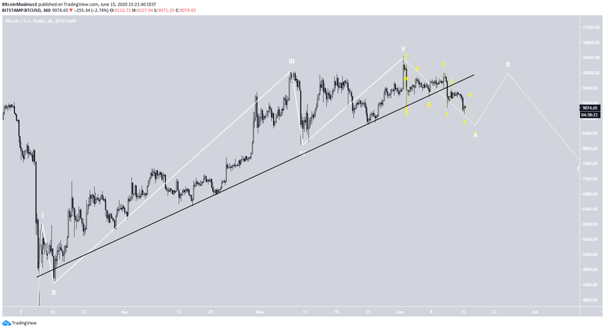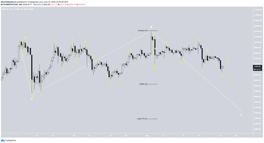 Первым возможным сценарием является коррекция W-X-Y. Тип этого движения предполагает, что предыдущий импульсивный ход завершился формированием максимума, который был отмечен 7 мая на $10,074. С тех пор цена корректируется.