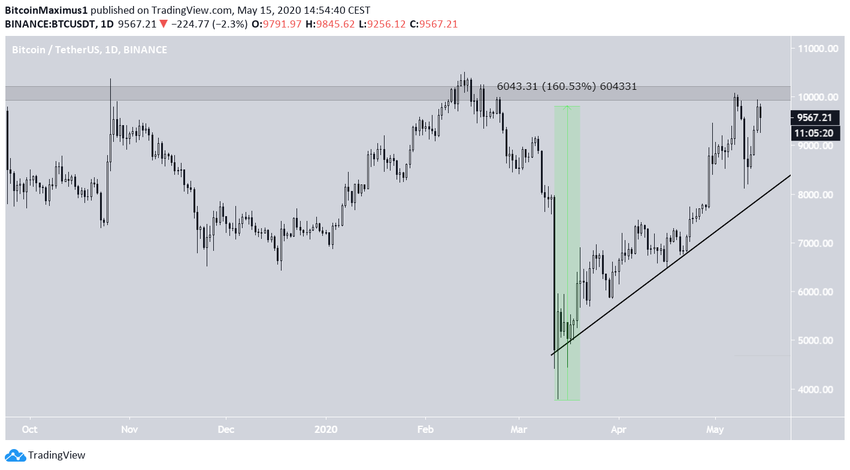 Кроме того, ВТС достиг важной области $10000, от которой отступил. Хотя, в отличие от нефти, на графике биткоина не наблюдается признаков медвежьей дивергенции, он все же сформировал понижающийся максимум. Это может служить указанием на то, что цена может снова начать снижение и даже еще раз достичь линии восходящей поддержки.