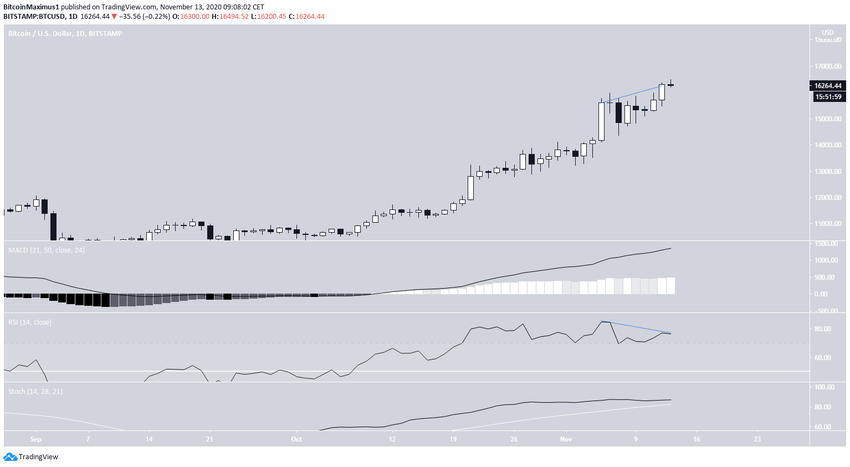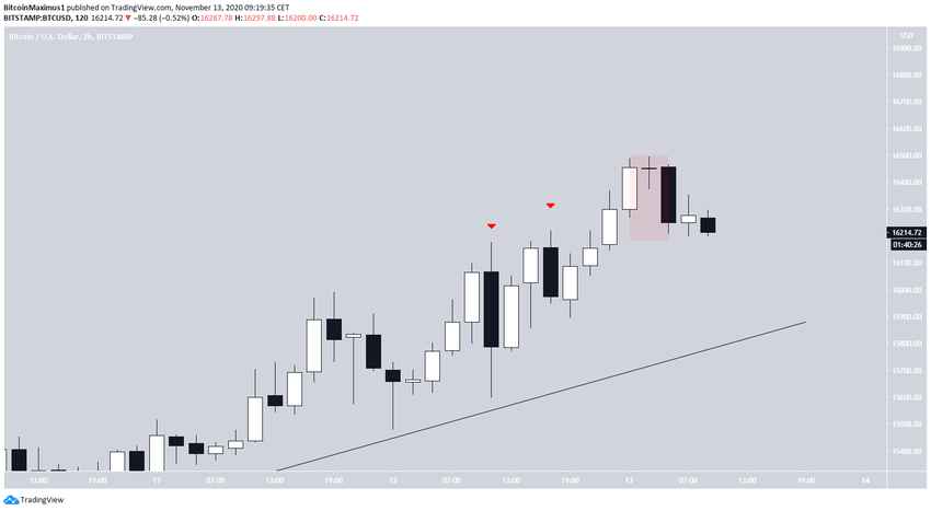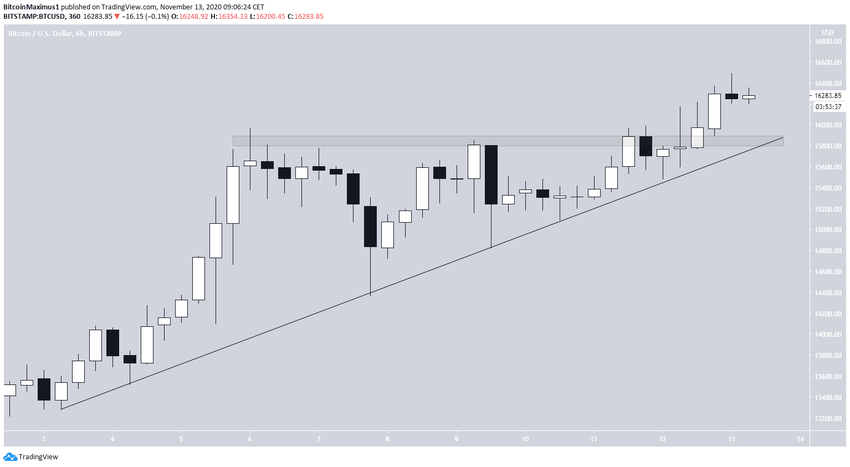 Курс биткоина (BTC) с 5 ноября торговался под областью сопротивления $15 800. Пара сформировала на графике восходящий треугольник и вчера смогла, наконец, совершить бычий прорыв, достигнув максимума на $16 494. После этого цена немного отступила.