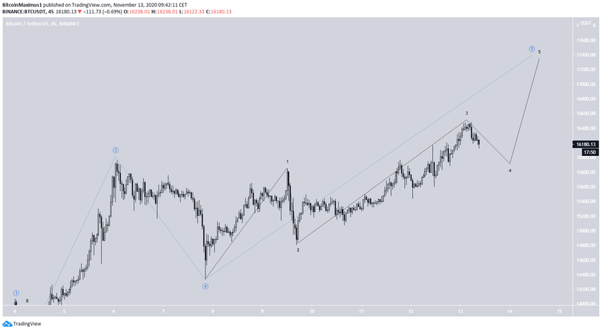 Вероятно, курс BTC находится внутри 5-й подволны (голубой цвет) 5-й волны, целевым уровнем для которой является область $16 900-$17 200.