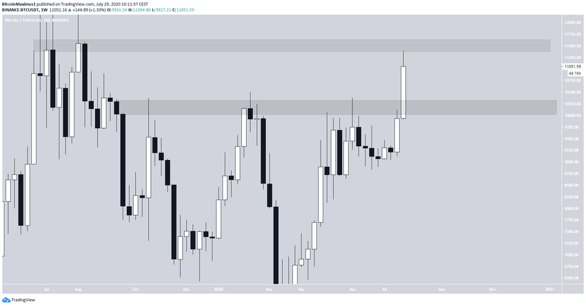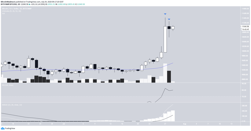 Биткоин сформировал на дневном графике свечу бычьего поглощения, дотянувшись до максимума $11 394 и пробив тем самым область предыдущего долгосрочного сопротивления.