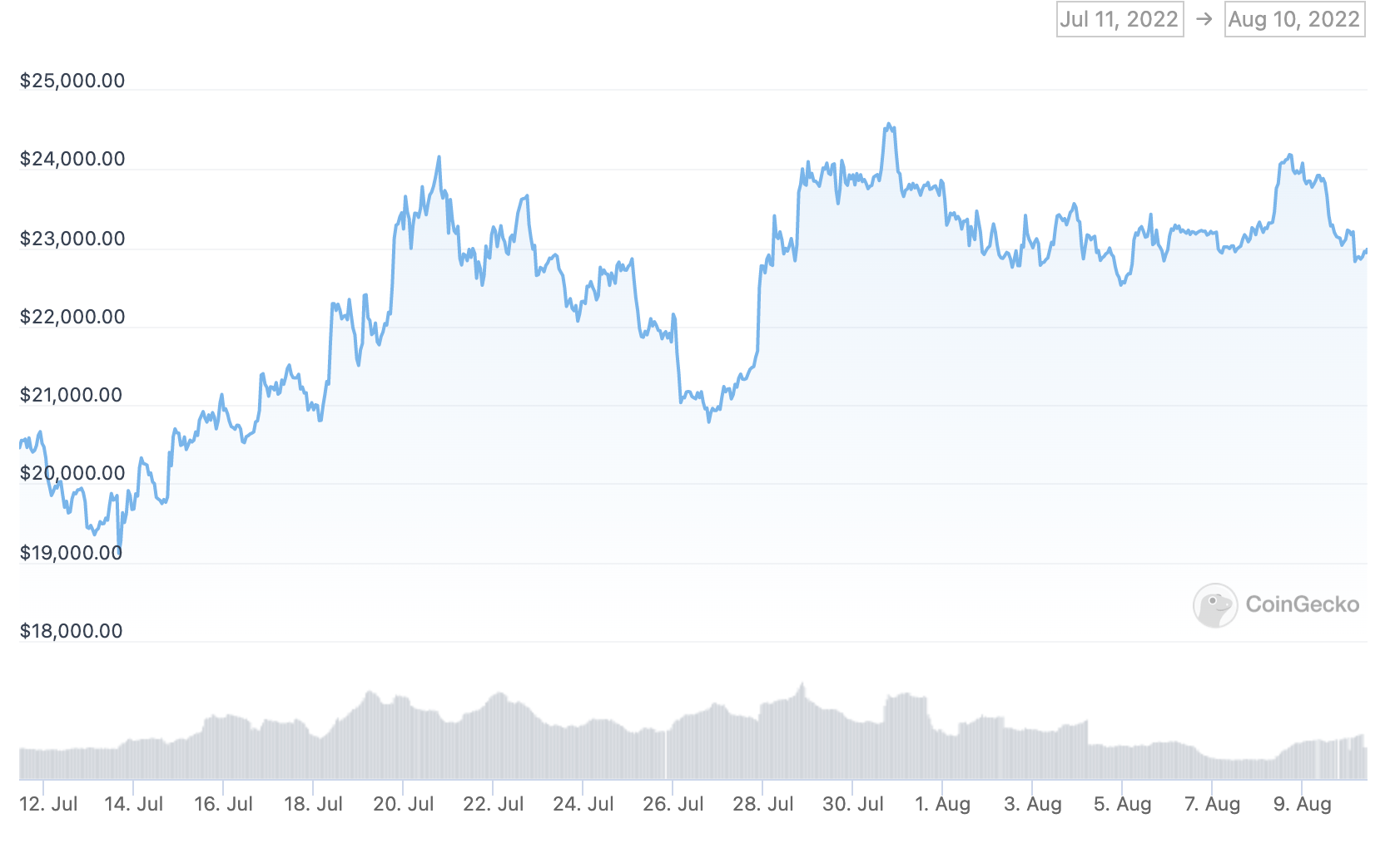 На момент публикации BTC/USD торгуется вблизи $23 000. За последние 30 дней курс биткоина вырос на 10%, однако в годовом соотношении он по-прежнему в минусе на 50%.