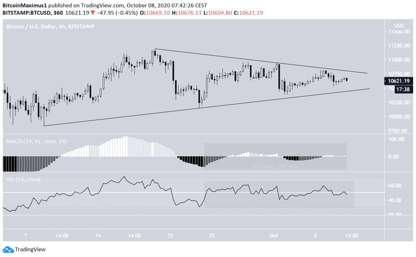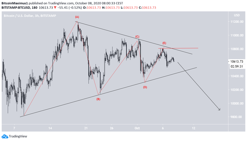 Итак, в настоящий момент, пока BTC находится в рамках текущего паттерна, сложно определить вектор его дальнейшего движения. Направление тренда определит либо подъем над уровнем $10 800, либо падение ниже or dips $10 380.