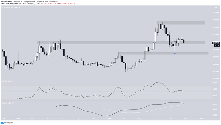 В настоящее время курс ADA, криптовалюты блокчейна Cardano, торгуется внутри области $0.10, которая должна оказать рынку поддержку. Во время роста в мае 2019 года эта же область сыграла роль сопротивления, но в конечном итоге цена все же прорвала ее в июле 2020 года. В процессе последующего снижения пара проверила эту область на прочность в качестве поддержки.
