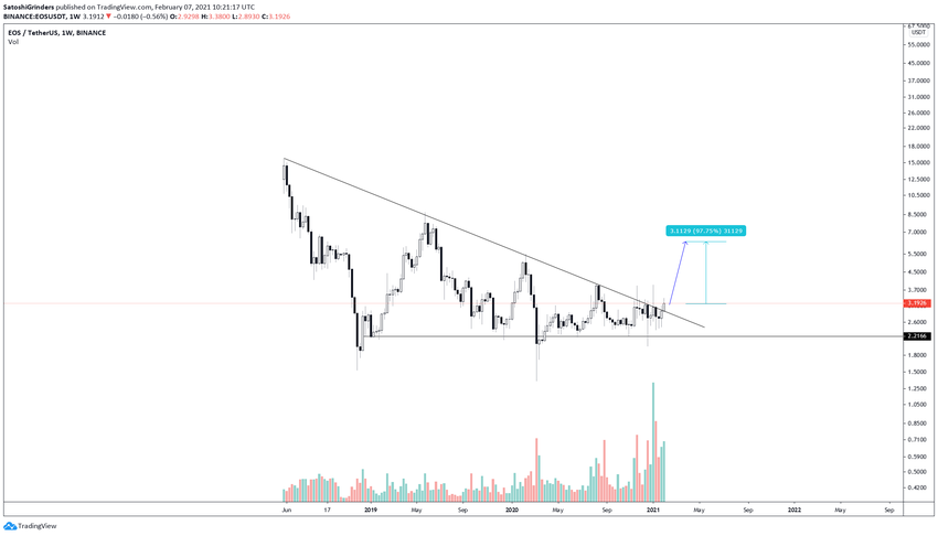 Курс криптовалюты EOS отметил в мае 2019 года максимум на $8,65 и с тех пор двигался вдоль линии нисходящего сопротивления. Цена предприняла три безуспешных попытки прорыва этого уровня и, наконец, в ноябре 2020 года смогла пронзить эту линию.