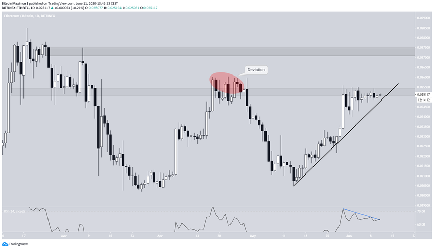Курс Ethereum (ETH) укрепляется с 14 мая, следуя вдоль линии поддержки, восходящей под очень крутым углом. На момент написания анализа, цена торговалась внутри области сопротивления ₿0.0252. Эта область на протяжении февраля играла роль поддержки, затем цена совершила ее медвежий прорыв и продолжила стремительно снижаться. В начале марта рынок попытался восстановиться над этой областью, но потом опять вернулся под нее и отправился на юг, свидетельствуя, что предыдущая ценовая динамика являлась скорее девиацией, чем истинным бычьим прорывом. Теперь эта область может снова сыграть роль сопротивления.