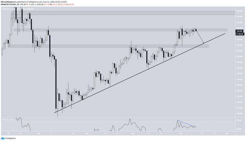 Тем временем ситуация в паре ETH/USD выглядит более однозначной. Цена торгуется внутри области сопротивления $245, а дневной RSI подает сильные сигналы медвежьей дивергенции. Это сулит валюте возможное снижение и еще одно тестирование линии восходящей поддержки, которая проходит сейчас на $225.
