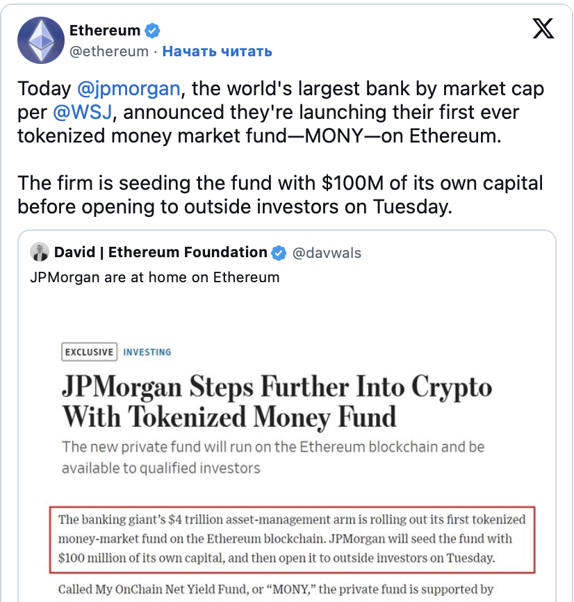 Инициатива JPMorgan укрепляет статус Ethereum как инфраструктуры для институциональных расчетов. Банк запускает фонд под названием MONY через собственную платформу цифровых активов. Первоначальное вложение составляет $100 млн, после чего доступ откроется для внешних инвесторов.
