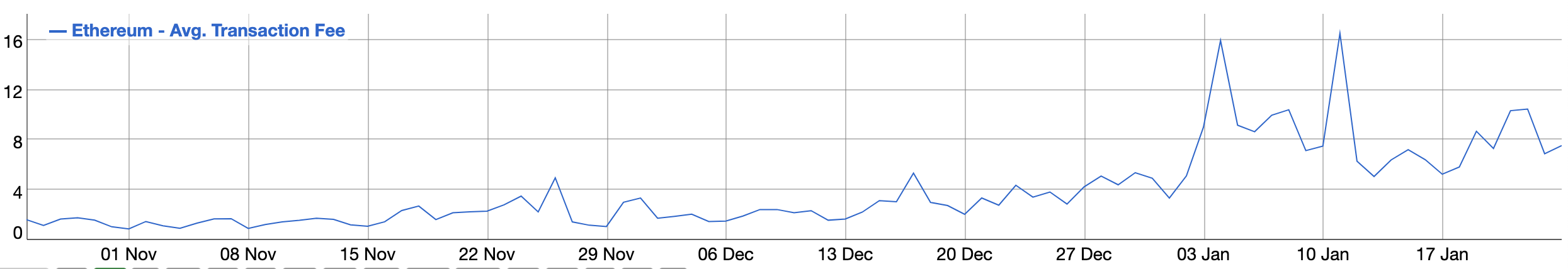 Вместе с ростом стоимости ETH выросла и средняя стоимость транзакций в сети. По данным bitinfocharts.com, цены на газ достигли $9,30. Максимум был зафиксирован 11 января на уровне $16. Несмотря на коррекцию, газ, скорее всего, продолжит дорожать в этом году.