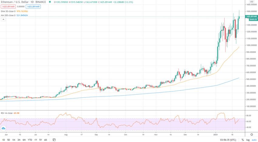 Курс обновил исторический максимум (ATH) на азиатской торговой сессии в понедельник, 25 января. Вторая по величине криптовалюта вплотную подошла к отметке $1500