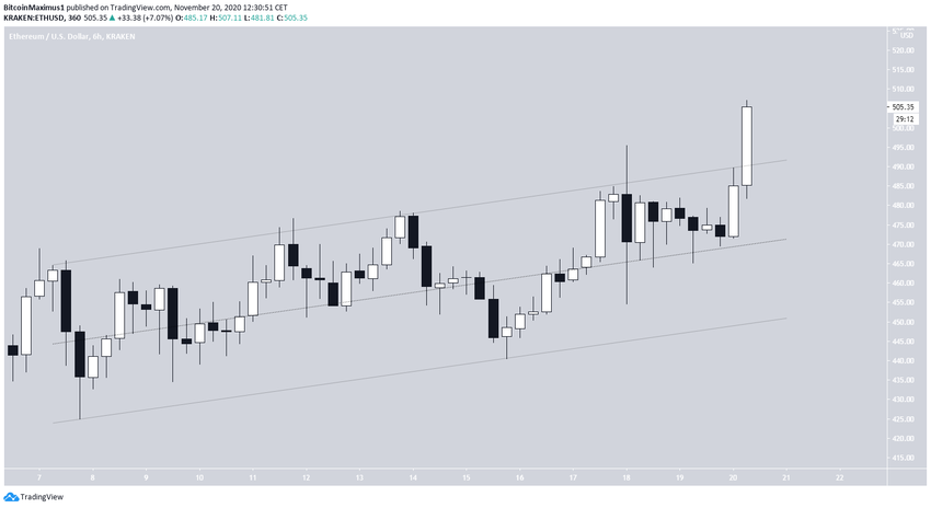 На еще более краткосрочном, 6-часовом, графике курс ETH уже совершил бычий пробой параллельного восходящего канала, и сейчас находится в процессе роста. Это также поддерживает шансы пары на рост к $545.