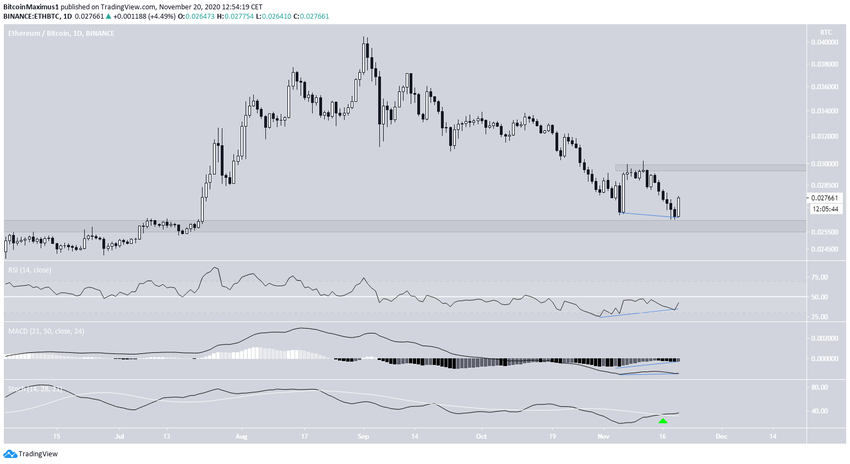 Курс ETH/BTC ощутимо просел с начала сентября. Однако цена достигла области поддержки ₿0.0260 и, вероятно, начала отскок от нее. Кроме того, на графике появился паттерн «двойное дно», что сопровождалось сильными сигналами бычьей дивергенции по RSI и MACD. Тем временем осциллятор стохастик сформировал бычье пересечение.