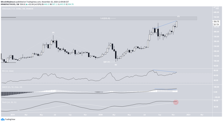 На момент написания ETH торговался над отметкой $500, держа курс на важный уровень сопротивления $545. Здесь проходит горизонтальное сопротивление, а также уровень Фибо 0.618 коррекции недавнего снижения.