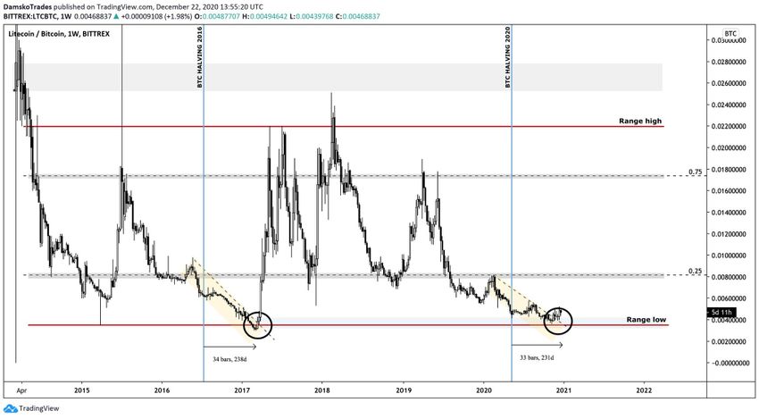 Криптовалютный трейдер @damskotrades поделился со своими читателями графиком LTC/BTC, отметив, что цена откатилась к минимумам диапазона. Далее он ожидает существенного роста пары.