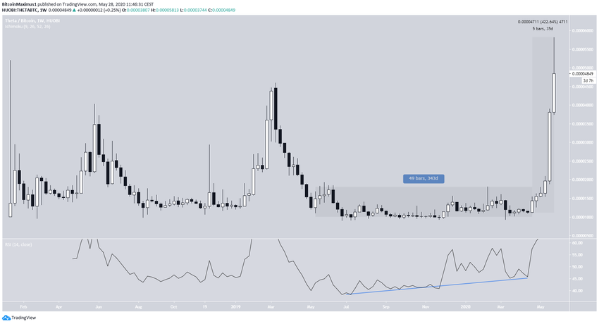 На недельном графике THETA можно увидеть, что валюта консолидировалась на протяжении 343 дней, при этом подавая сильные сигналы бычьей дивергенции по RSI. Затем пара перешла в агрессивную фазу роста, укрепившись всего за 35 дней на 422%. Это позволило ей установить 27 мая исторический максимум.
