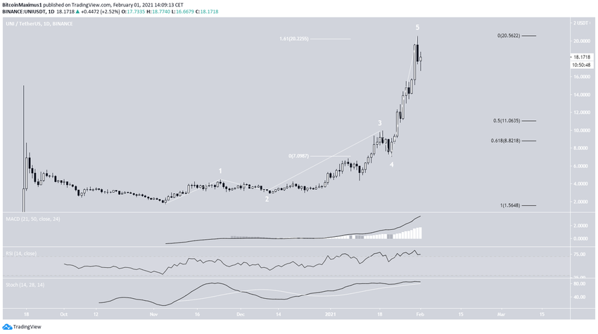 Несмотря на бычьи технические индикаторы, курс UNI, по всей видимости, находится в пятой, заключительной, волне бычьей импульсной ценовой структуры, которая начала формироваться в ноябре 2020 года. Волна 5 уже является ощутимо расширенной. Она достигла уровня 1.61 совокупной длины волн 1-3.