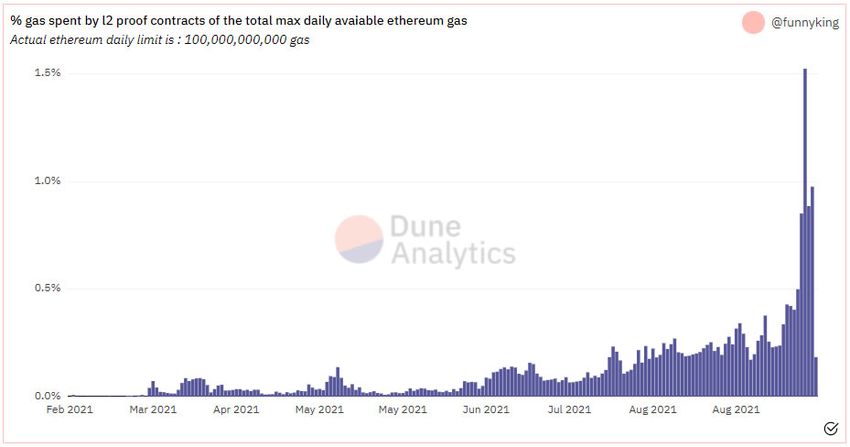Новая панель мониторинга на платформе Dune Analytics показывает, сколько газа поглощают платформы второго уровня (L2). Процент газа, расходуемого в день смарт-контрактами на основе L2, в последнее время вырос, но все еще очень низок по сравнению с ежедневным лимитом.