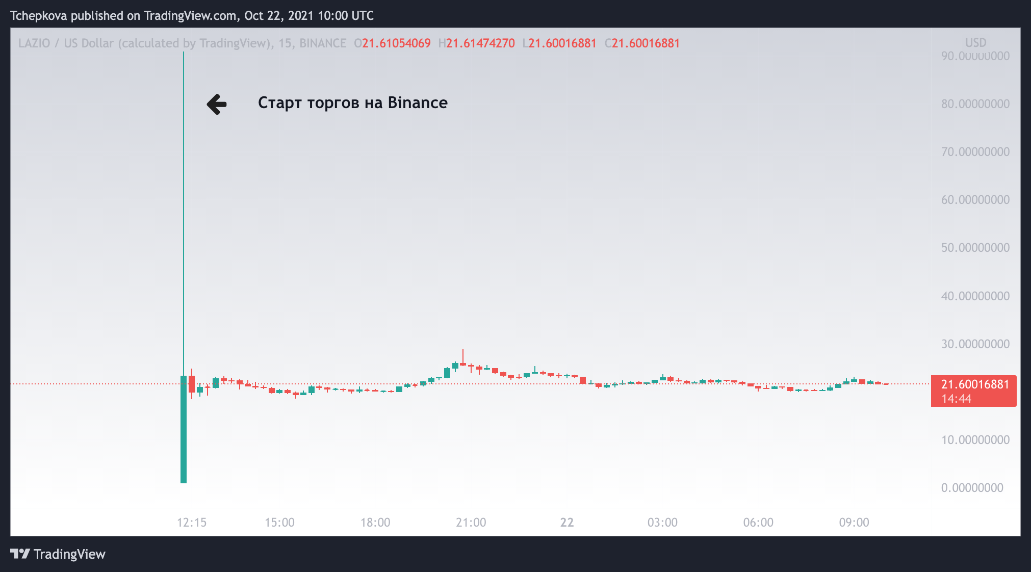 Курс токена LAZIO вырос почти на 2300% и достиг $22,2 после листинга на криптовалютной бирже Binance. Торги токеном начались 21 октября в 15:00 мск. Сразу после старта курс в взлетел более чем на 9000% до $90,89, однако также быстро спустился в район $22, где и обосновался.