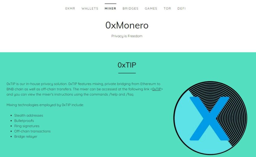 Недавно в экосистеме 0xMonero появился криптомиксер 0xTIP: он работает через Telegram-бот и позволяет анонимно перемещать 0xMR на блокчейне Ethereum на другой адрес в сети BNB.