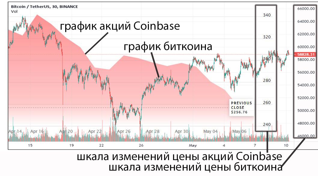 Уровень корреляции ценных бумаг организаций-представителей рынка цифровых активов и криптовалюты можно проследить через сравнение поведения курса акций Coinbase и графика биткоина: