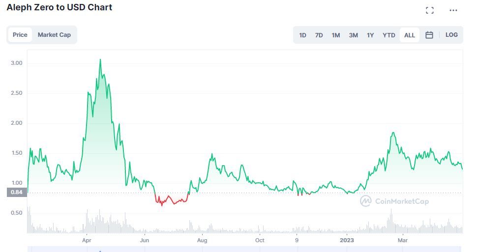 Во время основного раунда продаж в 2021 году, курс AZERO остановился на отметке $0.1. По состоянию на момент написания обзора, криптовалюта торгуется по $1.23. Максимум стоимости токена, по данным CoinMarketCap, зафиксирован 14 апреля 2022 года на уровне $3.0915.