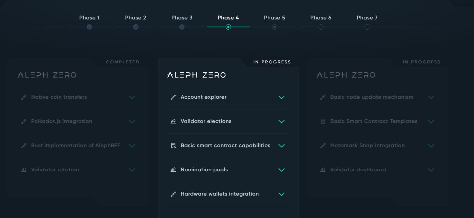 Команда Aleph Zero группирует задачи, направленные на развитие проектов, по фазам. По состоянию на момент написания обзора, в дорожной карте представлено 5 фаз разработки, из которых 3 — уже пройдены. На очереди — четвертая.
