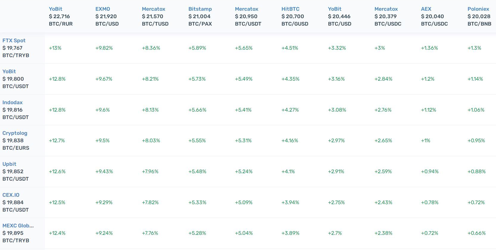 - Простой арбитраж. Задача – купить на одной бирже дешевле определенный актив, и продать его подороже на другой торговой платформе. Осуществлять мониторинг арбитража криптовалют можно при помощи сравнения цен криптобирж.