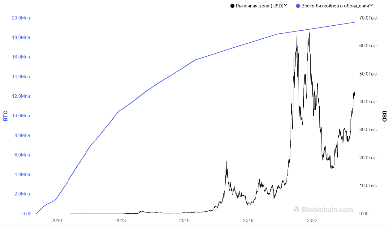 Всего будет намайнен (добыт) 21 млн BTC. По состоянию на январь 2024 года, уже добыто 19,5 млн биткоинов. На графике ниже видно, что курс BTC (черная кривая) растет по мере добычи новых монет (синяя кривая). При этом биткоин растет неравномерно. На графике видны вспышки роста, после которых монета выходит в коррекцию. Такое поведение криптовалюты — реакция рынка на халвинги.