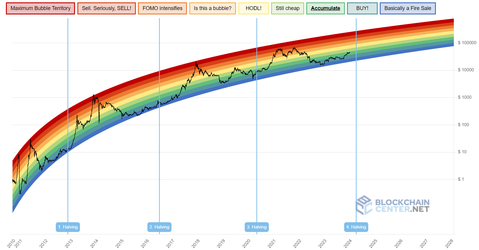 Проще всего визуализировать цикличность движений и потенциал роста BTC при помощи радужного графика. На нем вертикальными линиями обозначены халвинги. Черная кривая — курс биткоина. Обратите внимание на то, что BTC обновлял ATH, примерно, спустя полтора года после каждого из халвингов и после выходил в коррекцию. И так в каждом цикле (циклами в криптосообществе называют период между халвингами, то есть цикл BTC длится, примерно, 4 года) Сама радуга — цветовой индикатор, который позволяет понять, дорого (красная зона) или дешево (синяя зона) биткоин стоил в каждый промежуток времени.
