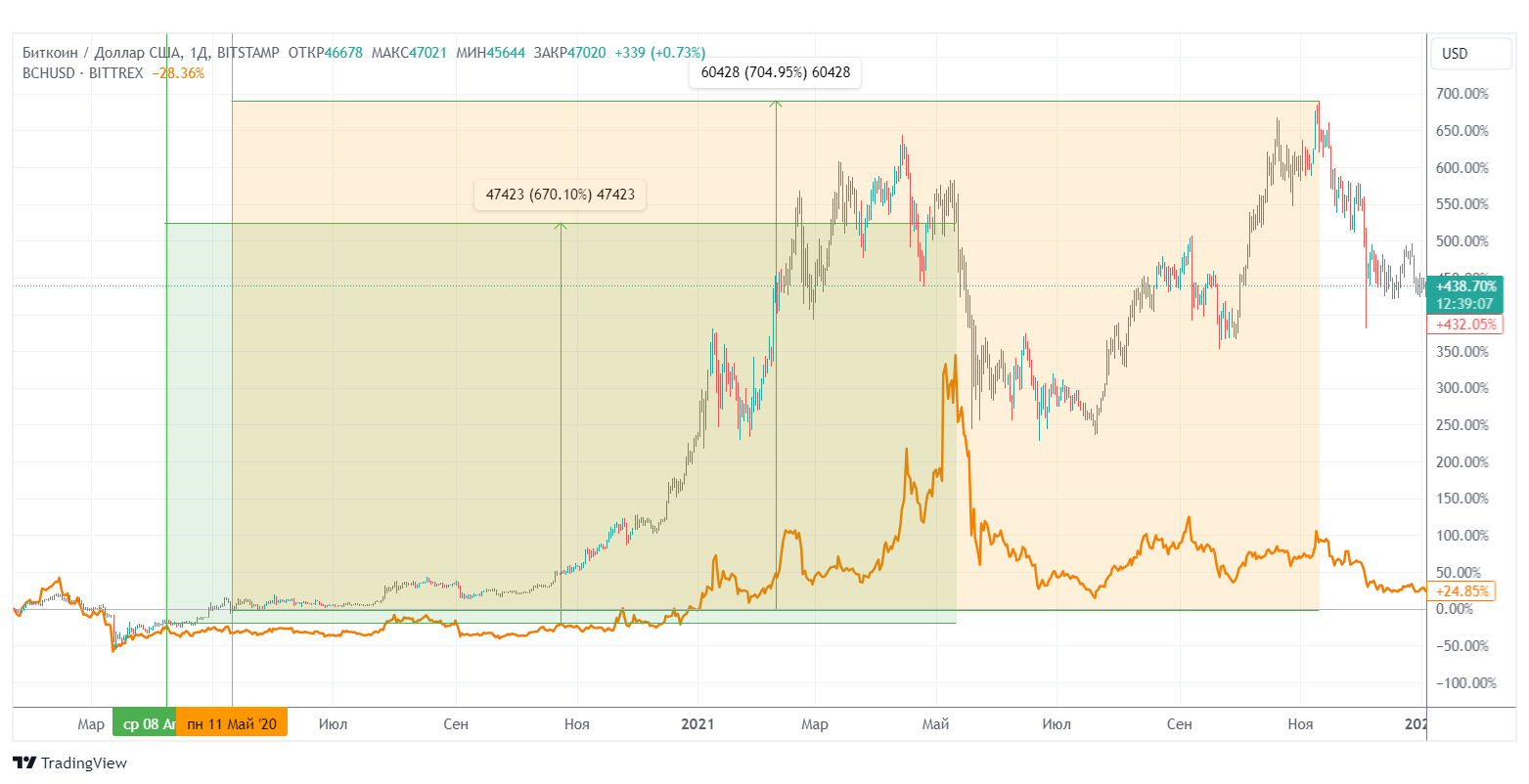 - Максимум стоимости биткоина с момента халвинга составил плюс 704% к стоимости. Результат Bitcoin Cash — плюс 670%.