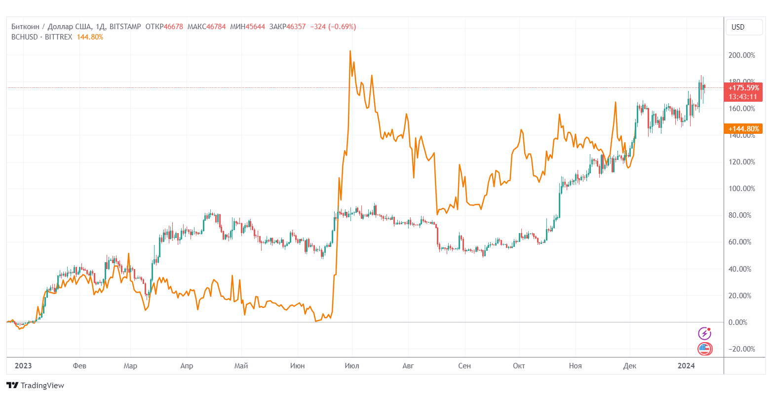 Сравнение поведения биткоина и Bitcoin Cash показывает, что BCH повторяет многие движения BTC. Поэтому можно предположить, что на фоне халвингов (своего и BTC) и ожидаемого позитивного эффекта от запуска торгов спотовыми биткоин-ETF Bitcoin Cash также продемонстрирует рост в 2024 году. При этом статистика говорит о том, что BCH вряд ли сможет обогнать BTC по темпам роста.