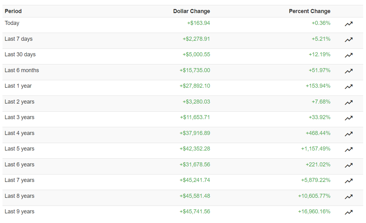 Еще один способ визуализировать цикличность движения биткоина — статистика, которая показывает, как менялся курс криптовалюты за последние 9 лет. По состоянию на момент написания обзора, все инвесторы BTC получили прибыль. Например, те, кто купил биткоин год назад, увеличили вложения на 153%. Ранним инвесторам повезло больше. За годы существования криптовалюты, благодаря халвингам и ограниченной эмиссии BTC, их вложения выросли на тысячи процентов.
