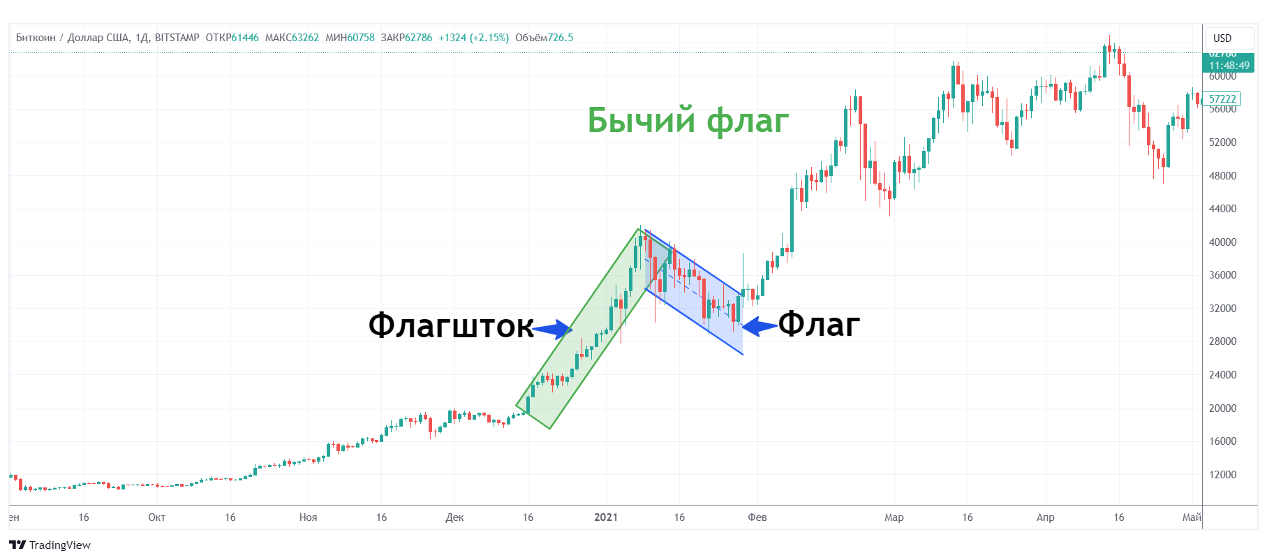 - Флагшток (Pole). Это крутой рост курса актива, который инициирует паттерн. Флагшток образуется в результате резкого восходящего движения, которое является началом формирования бычьего флага.