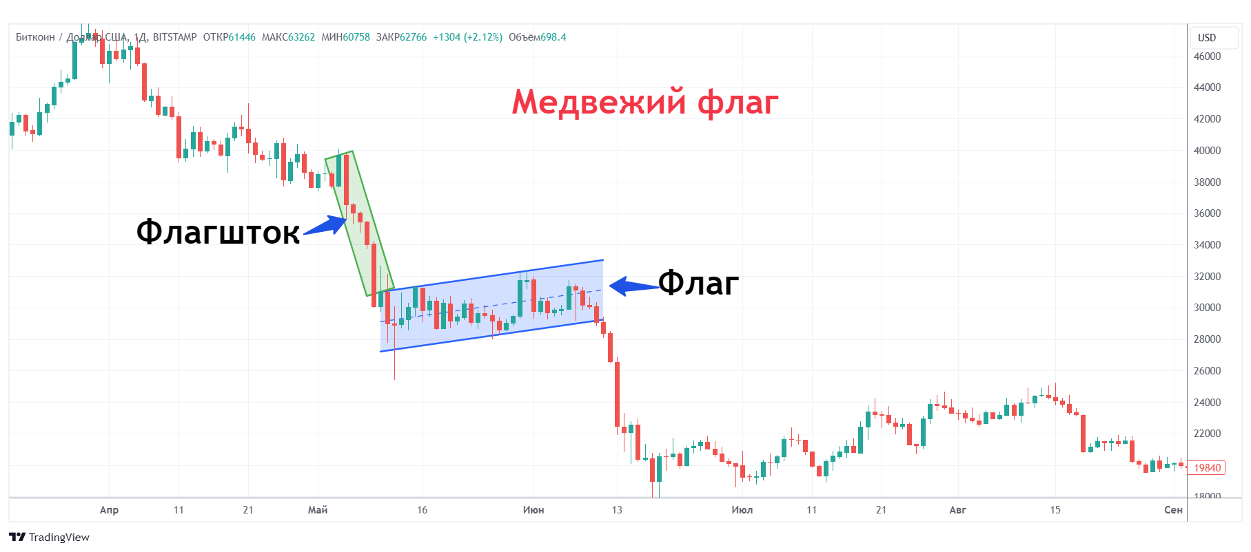 - Флагшток (Pole). Это крутое падение цен, которое инициирует паттерн. Флагшток образуется в результате резкого нисходящего движения, которое является началом формирования медвежьего флага.