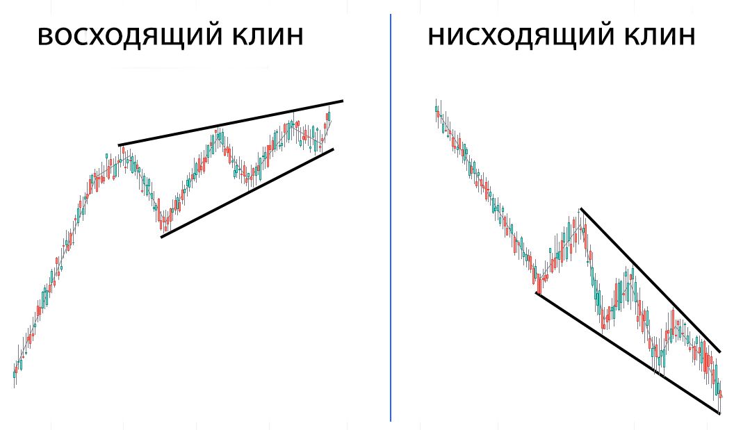 - Клин. Линии тренда сходятся, образуя угол. Клин может быть направлен вверх или вниз, и чаще всего предвещает разворот тренда, а не его продолжение.