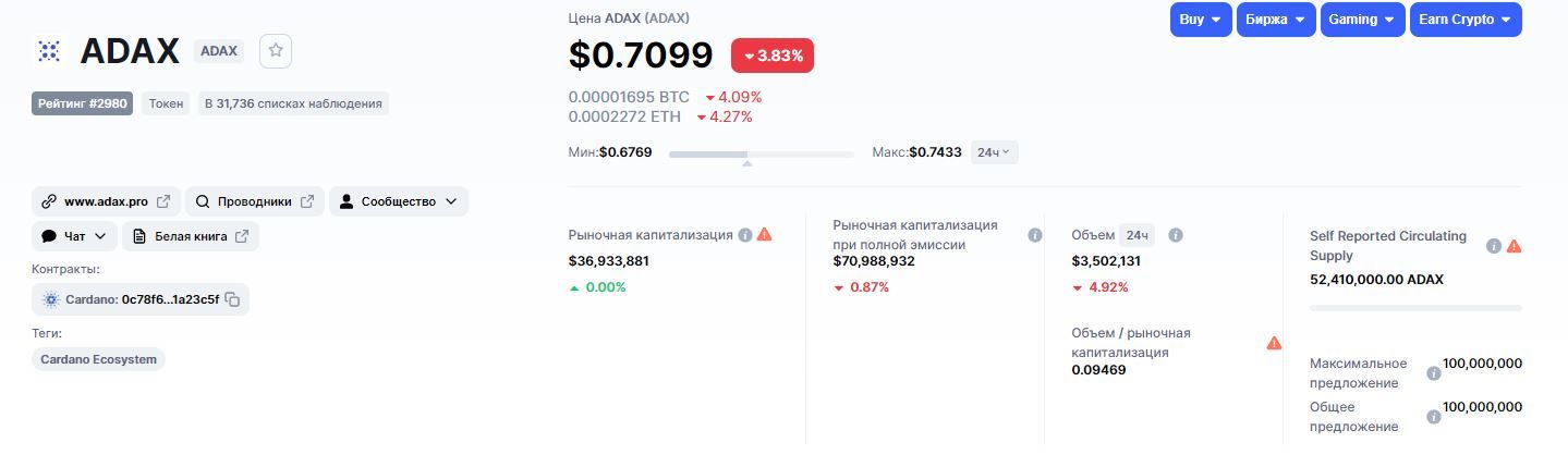 У проекта есть собственный нативный токен – ADAX. Эмиссия актива ограничена. Всего будет выпущено 100 млн монет. По состоянию на момент написания обзора, на рынке циркулирует 52,410,000 токенов проекта.