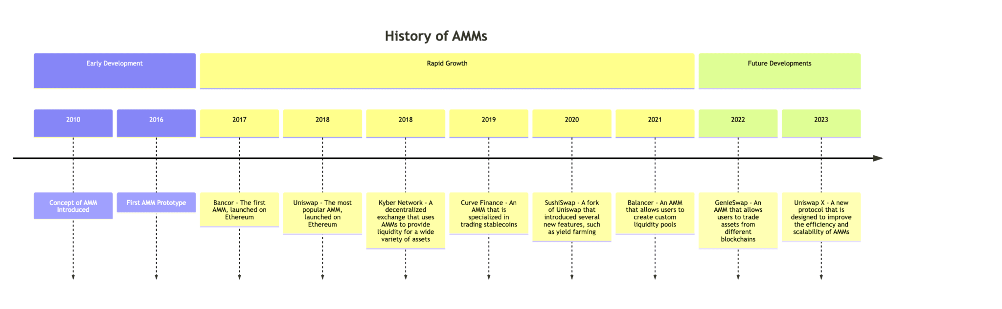 Первым протоколом децентрализованных финансов (DeFi), который внедрил AMM, стал Bankor. Но настоящую популярность инструмент приобрел с запуском Uniswap. Вслед за ней на рынке появилось сразу несколько децентрализованных бирж с поддержкой AMM, таких как PancakeSwap и SushiSwap. В 2023 году автоматический маркет-мейкер появился даже в решениях второго уровня, таких как Polygon — недавно сайдчейн начал использовать AMM в виде Uniswap V3.
