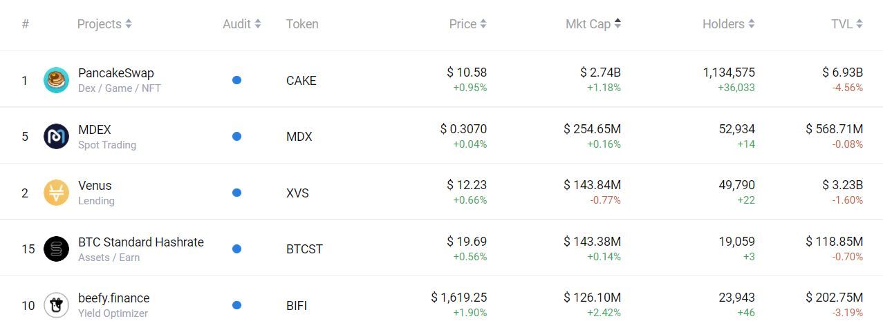 По состоянию на момент написания обзора, топ-5 проектов на BSC по показателям рыночной капитализации выглядит следующим образом: