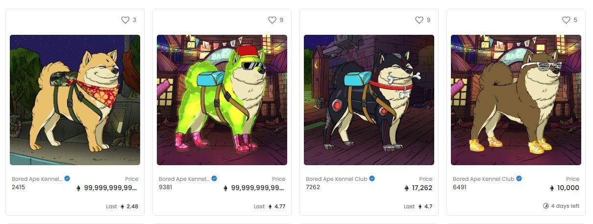 Коллекция Bored Ape Kennel Club состоит из 10 000 токенов с изображением стилизованных собак. Каждый из членов клуба Bored Ape Yacht Club получил доступ к NFT с собаками (разработчики выдавали по одной «собаке» на каждую из «скучающих обезьян»).
