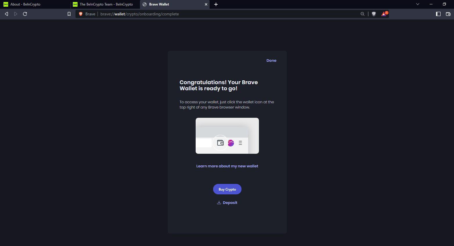 - Перейдите в Brave Browser, нажмите на символ кошелька в правом верхнем углу экрана, а затем – на кнопку Learn more.