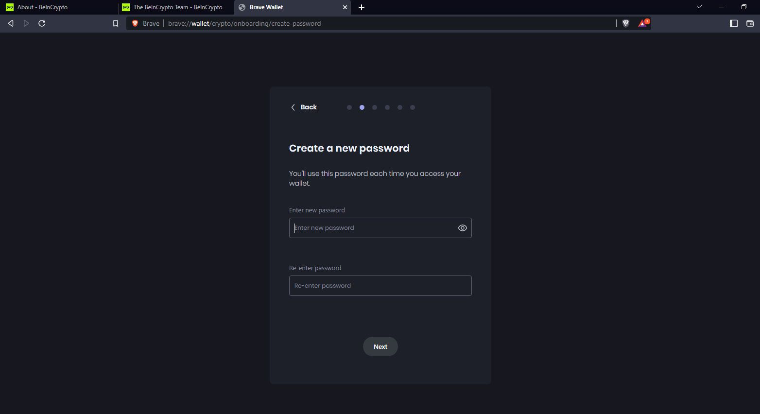 3. Создайте пароль для кошелька Brave Wallet, подтвердите его и нажмите Next.
