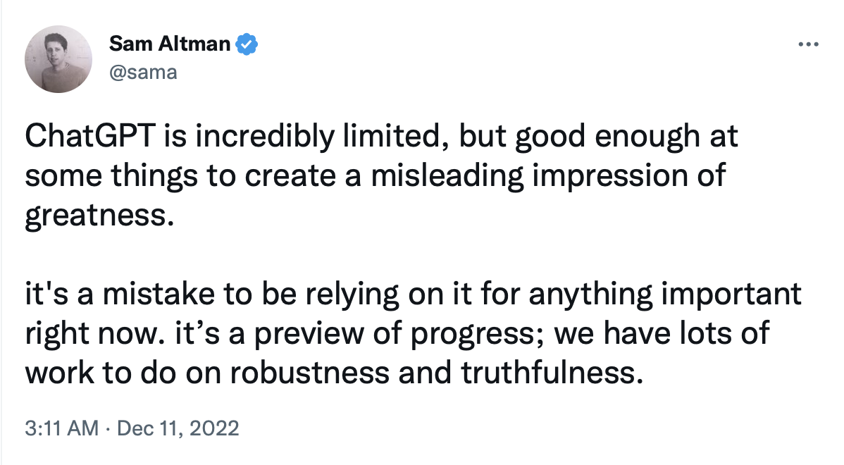 ChatGPT — отличный пример использования искусственного интеллекта и машинного обучения в полезных целях. Однако технология все еще находится на ранних стадиях развития. Соучредитель и генеральный директор OpenAI Сэм Альтман публично заявил, что бот невероятно ограничен, и полагаться на него в чем-то важном будет ошибкой.