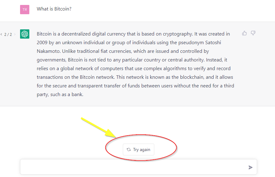 В качестве отправной точки мы спросили его, что такое биткоин — ChatGPT потратил на ответ около 5 секунд, при этом объяснение было простым и понятным. Если вас не устраивает полученная информация, вы можете нажать кнопку Try Again.