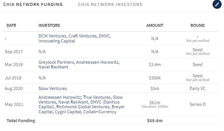 В том числе, Chia Network получил финансирование от Andreessen Horowitz и Richmond Global Ventures. На фоне завершения D-серии инвестраунда в мае 2021 года оценка проекта достигла $500 млн.