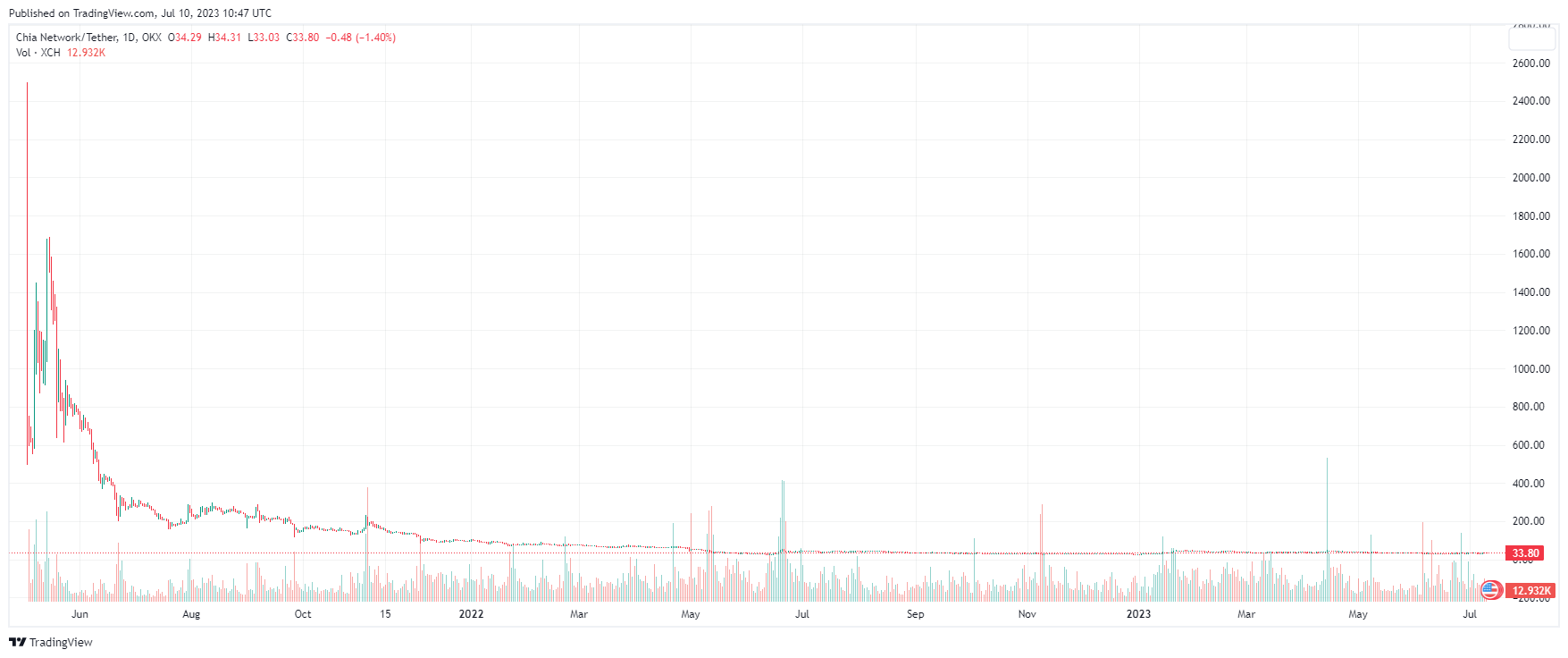 Курс чиа находится в затяжном падении с мая 2021 года. По состоянию на момент написания обзора, монета торгуется на 98.26% ниже максимума, зафиксированного 3 мая 2021 года на уровне $1,934.