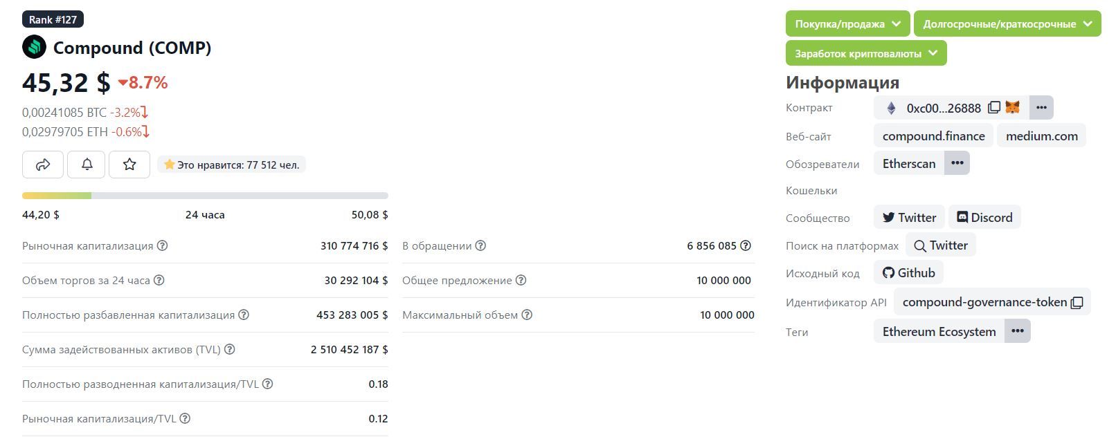 Пик стоимости COMP, по данным ресурса CoinGecko, зафиксирован 12 мая 2021 года на высоте $910,54. Во время обновления максимума биткоином в ноябре 2021 года монета продемонстрировала лишь небольшой рост.